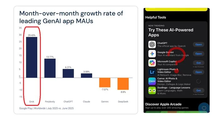 Thus, while Google Gemini and DeepSeek saw decreases, other well-known GenAI apps, such as Claude, saw only 3.08% growth. Additionally, the data indicates that Grok is becoming increasingly popular. Therefore, it is all the more shocking that it was left off of the Apple Store’s carefully curated AI list.